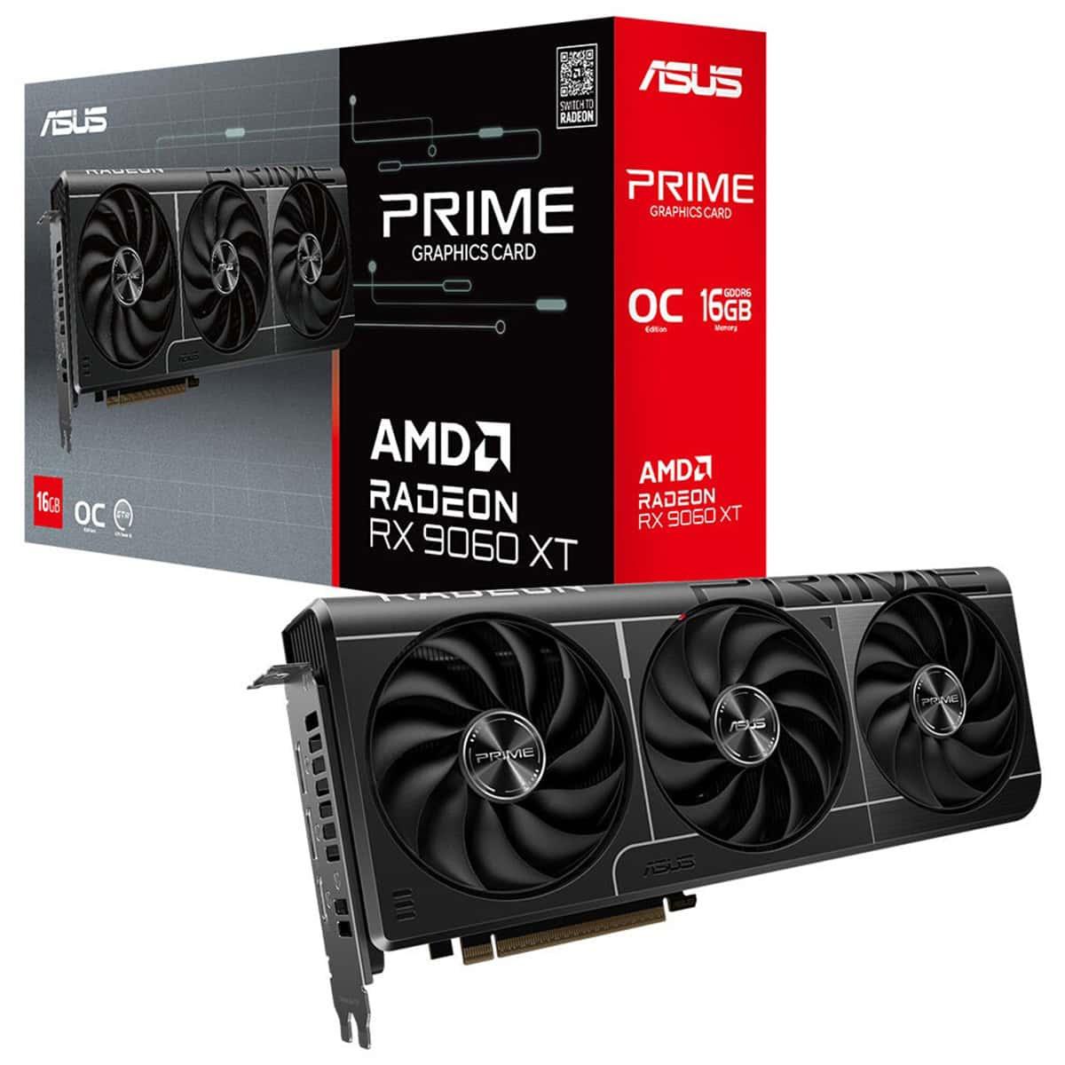Prime Radeon™ RX 9060 XT, üç adet eksen teknolojili fanın ekran kartının yan havalandırmasından en iyi şekilde faydalanması ve en uygun termal performans sunması için özenle planlanmış koruma, soğutma bloğu ve ısı borusu düzeniyle 2,5 yuva yer kaplayan tasarıma sahip.
