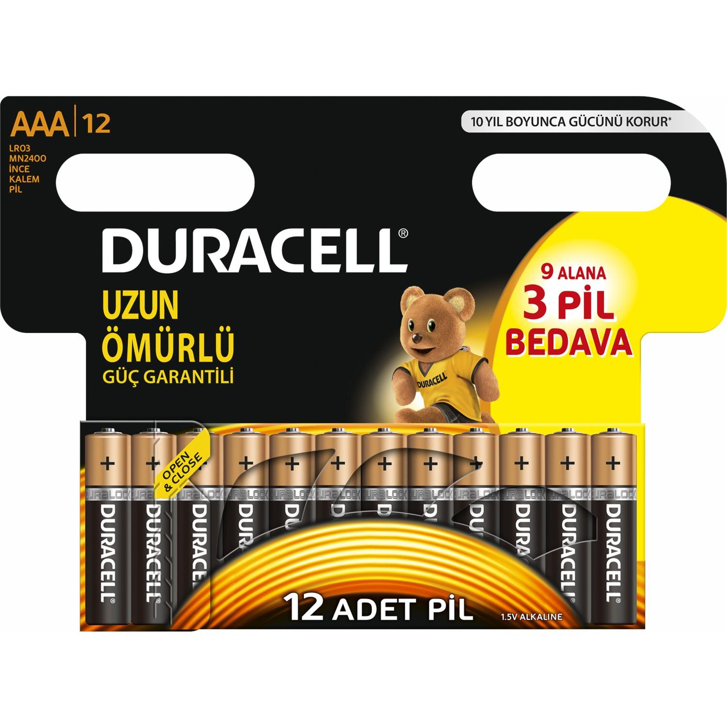 Duracell, güvenilir güç gerektiren elektronik cihazlarda kullanılmak üzere geniş bir pil yelpazesi sunmaktadır. Duracell Basic AAA piller, biraz ek güç gerektiren günlük cihazlara güvenilir şekilde güç sağlamak için ideal çok amaçlı alkalin pillerdir. Duracell alkalin piller, AA, AAA, C, D ve 9V boylarında sunulmaktadır. Duralock teknolojisi, normal koşullarda saklandıklarında kullanılmamış Duracell pilleri 10 yıla kadar yeni ve dolu tutar. Bu piller, size güvenebileceğiniz bir ürün sağlayarak, cihazlarınızdan keyif alma özgürlüğü verir. Duracell piller, motorlu oyuncaklar, piller, taşınabilir oyun konsolları, uzaktan kumandalar, CD oynatıcılar vb günlük cihazlarınızda güvenilir, uzun ömürlü güç istediğinizde ideal çözümlerdir.