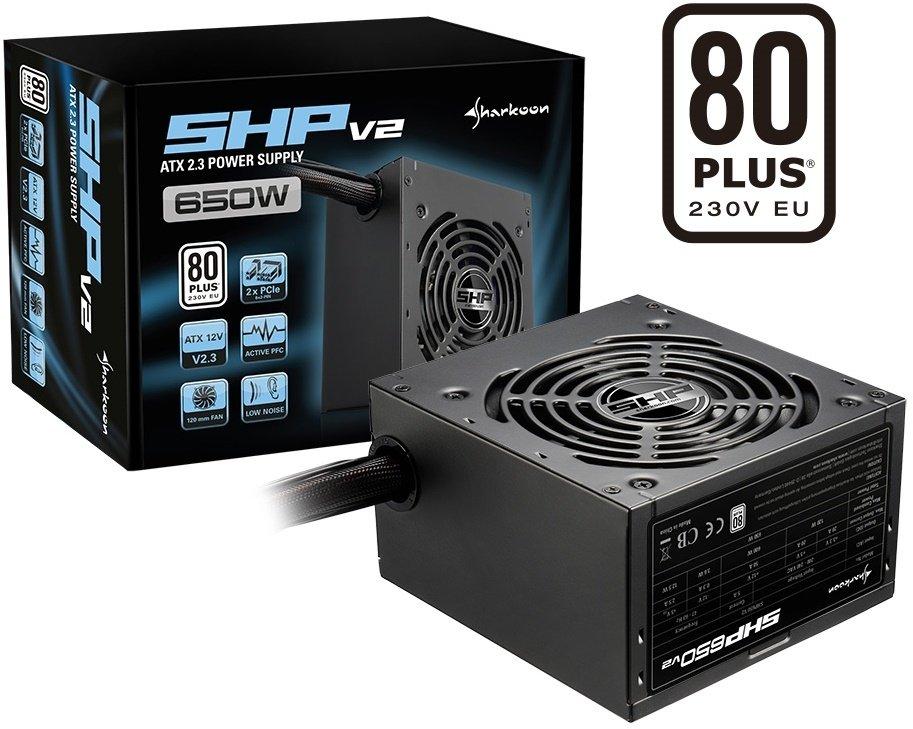Sharkoon SHP V2, her türlü ofis, multimedya ve oyun PC'sinde bir ev bulabilen, ihtiyatlı siyah gövdesi sayesinde "80 PLUS" sertifikalı çok yönlü güç kaynağıdır. Düzenli görünümü, benzer şekilde siyah çevresel kabloları ve siyah tekstil örgülü ana kart kablosuyla desteklenir. SHP V2, dört adete kadar SATA sürücüsü ve üç adet IDE aygıtı için güç sağlayabilir ve ayrıca iki adet 6 + 2-pinli PCIe konektörlü modern grafik kartlarını destekler. Gerekirse, güç kaynağı aynı zamanda bir disket sürücüsüne bağlanma ve güç sağlama yeteneği de sağlar.